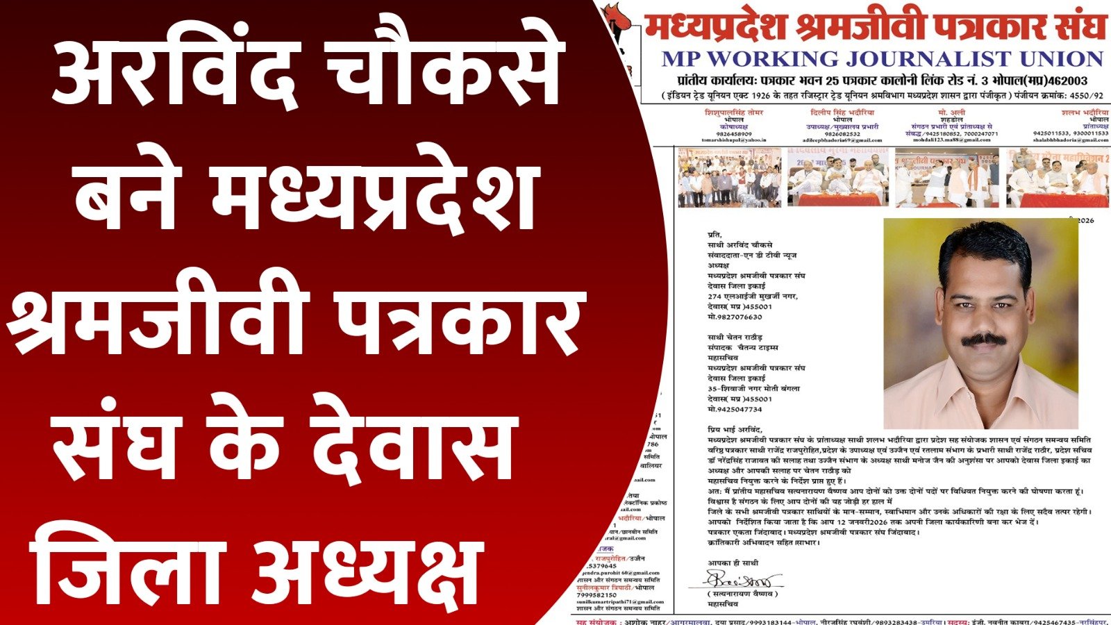 प्रदेश सह संयोजक संगठन एवं शासन राजेंद्र राजपुरोहित, प्रदेश उपाध्यक्ष व उज्जैन और रतलाम संभाग के प्रभारी राजेंद्र राठौर तथा प्रदेश सचिव डा. नरेंद्र सिंह राजावत के सुझाव पर संगठन के प्रदेश महासचिव सत्यनारायण वैष्णव ने संघ के वरिष्ठ पत्रकार अरविंद चौकसे को मध्य प्रदेश श्रमजीवी पत्रकार संघ का देवास जिला अध्यक्ष नियुक्त किया है । चौकसे की इस नियुक्ति पर जिले भर के पत्रकारों में हर्ष व्याप्त हैं।