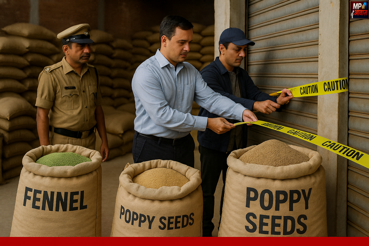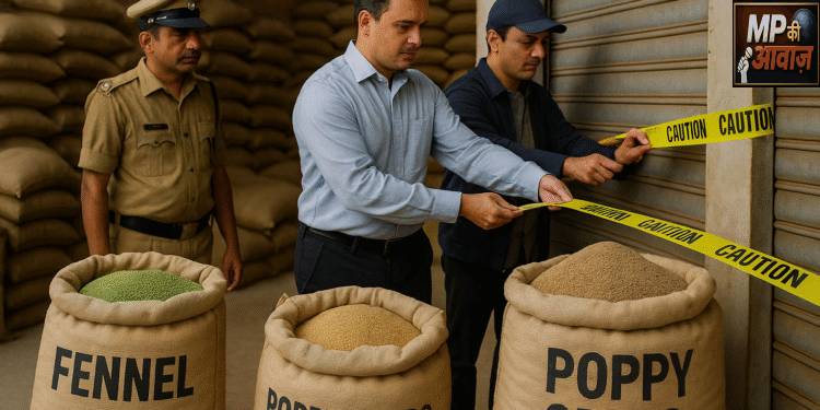 इंदौर के सियागंज क्षेत्र में जिला प्रशासन की बड़ी कार्यवाही में 900 किलोग्राम सौंफ और 400 किलोग्राम खसखस जब्त कर गोदाम किया सील