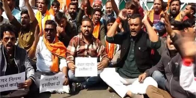 भोपाल : राजधानी भोपाल में 26 टन गौ मांस मिलने का मामला लगातार तूल पकड़ता जा रहा है। इसे लेकर हिंदूवादी संगठनों का विरोध प्रदर्शन कम होने का नाम नहीं ले रही है। मामले में एक ओर जहां SIT जांच कर रही है, वहीं दूसरी ओर संगठन महापौर मालती राय के इस्तीफे की मांग करते नजर आ रहे हैं। इसी कड़ी राजधानी भोपाल में महापौर के सरकारी आवास में बजरंग दल के कार्यकर्ता बड़ी संख्या में पहुंचे। जहां उन्होंने मालती राय के निवास के बाहर लगे पोस्टर फाड़े साथ ही नेम प्लेट पर कालिक पोती।