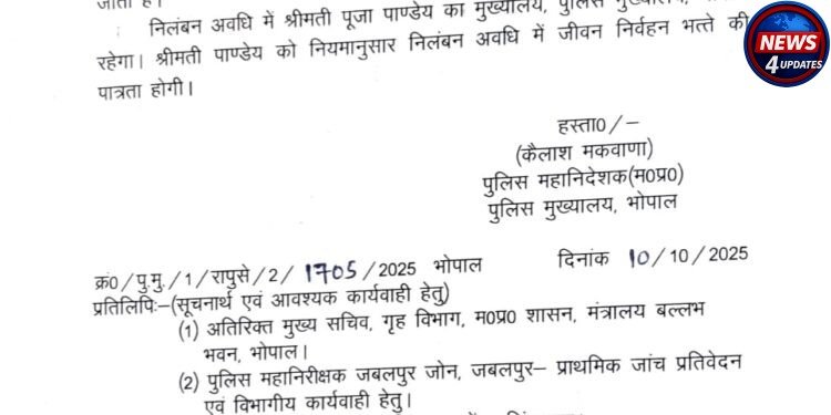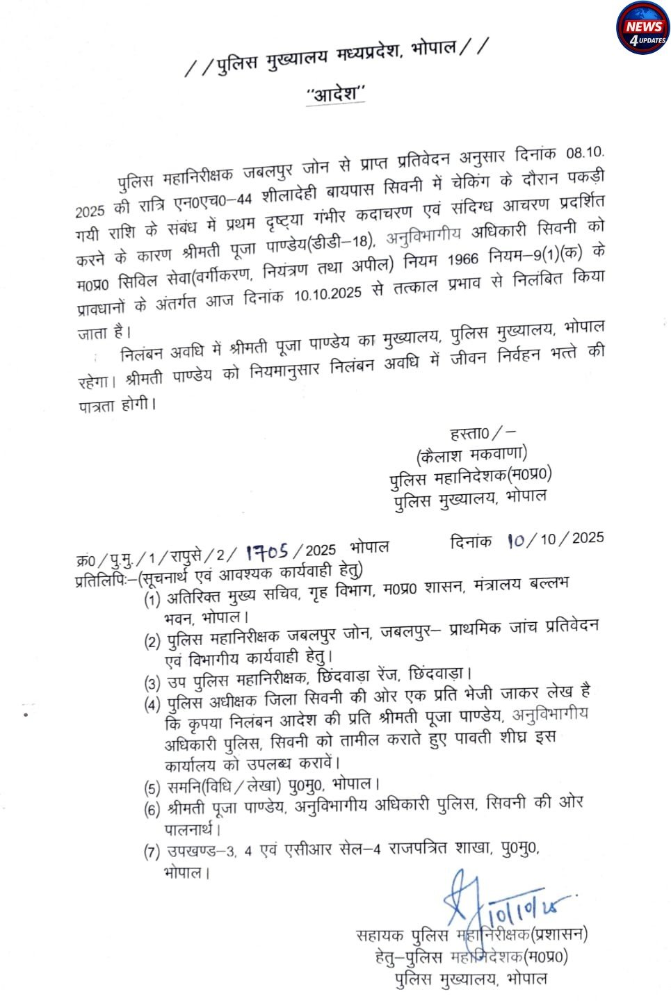 SDOP पूजा पांडे को डीजीपी श्री कैलाश मकवाना ने सस्पेंड किया