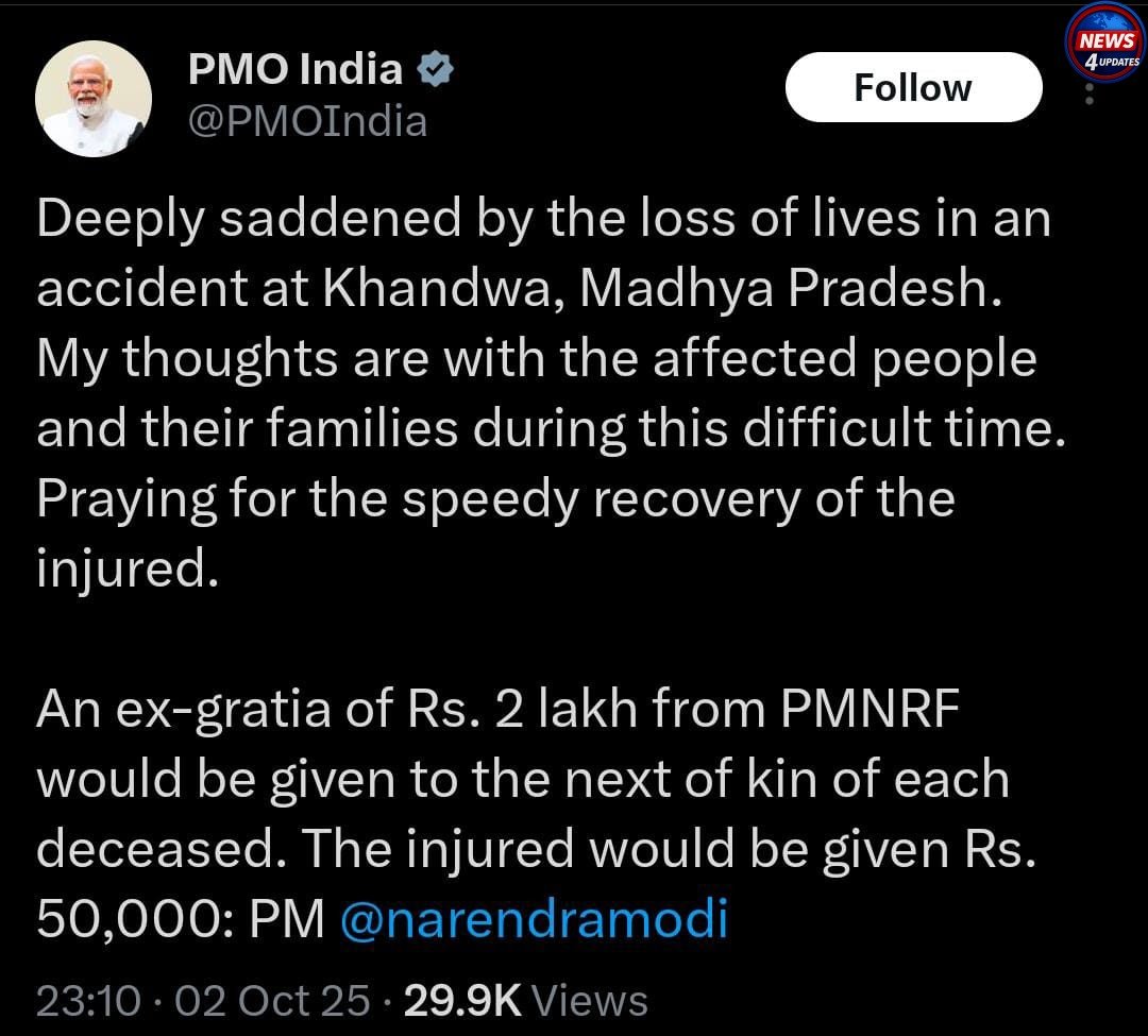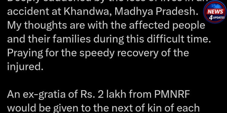 प्रधानमंत्री नरेंद्र मोदी ने खंडवा, मध्य प्रदेश में हुए हादसे में लोगों की मौत पर गहरा दुख व्यक्त किया है। उन्होंने मृतकों के परिवारों के प्रति संवेदनाएं व्यक्त की हैं और घायलों के जल्द स्वस्थ होने की कामना की है।