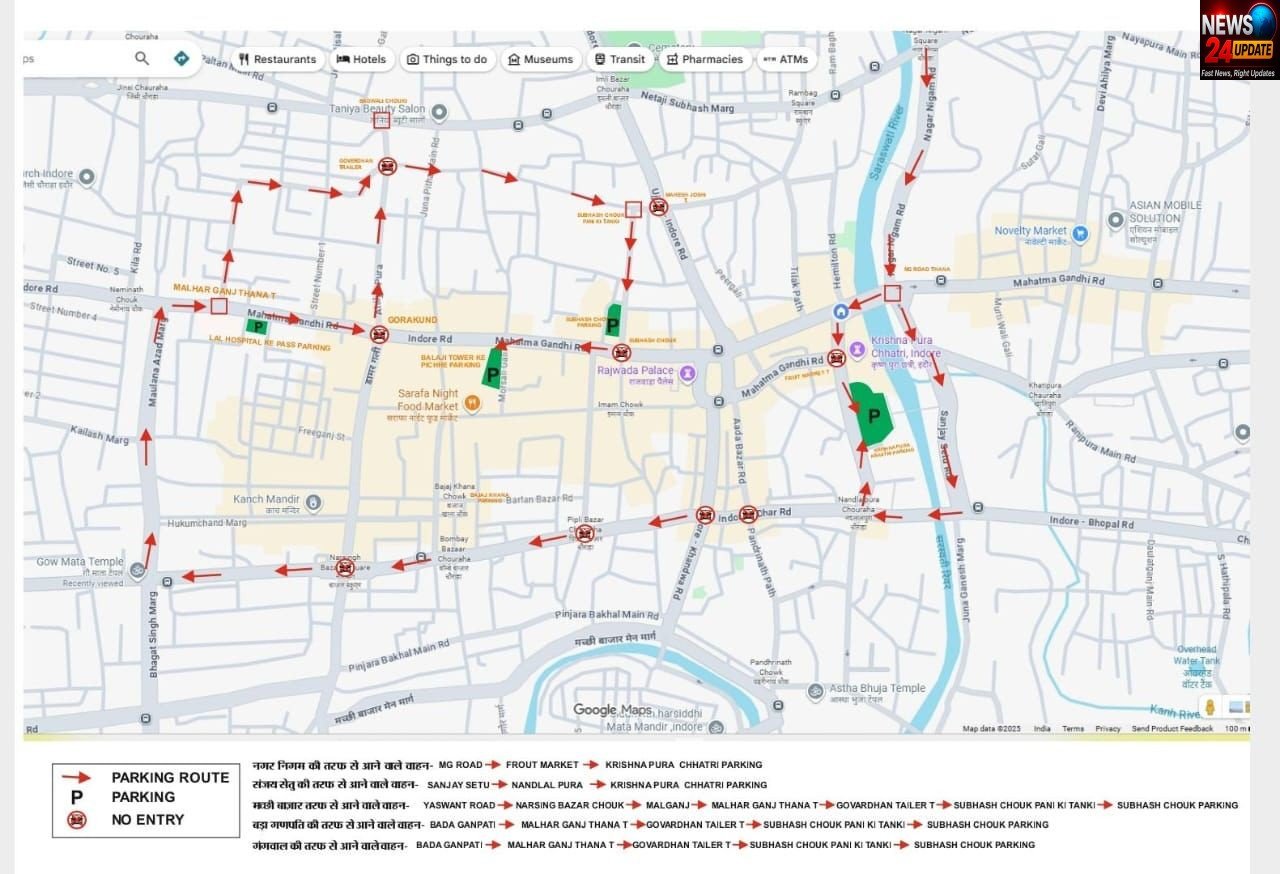 ◆ इन मार्गो से यातायात डायवर्जन किया जाएगा – मल्हारगंज थाना टी, छिपा बाखल गली, गोवर्धन टेलर तिराहा, गोराकुंड चौराहा, सुभाष चौक पानी की टंकी, महेश जोशी तिराहा, सुभाष चौक, इमली बाजार चौराहा, मालगंज चौराहा, नरसिंह बाजार चौराहा, जी. सच्चिदानंद तिराहा, पीपली बाजार तिराहा, यशवंत रोड चौराहा, आडा बाजार चौक, मच्छी बाजार चौक, पंढरीनाथ मंदिर चौक, रेशम गली, नंदलाल पुरा चौक, संजय सेतु, फ्रूट मार्केट, हेमिल्टन रोड, मृगनयनी चौराहा, नगर निगम चौराहा