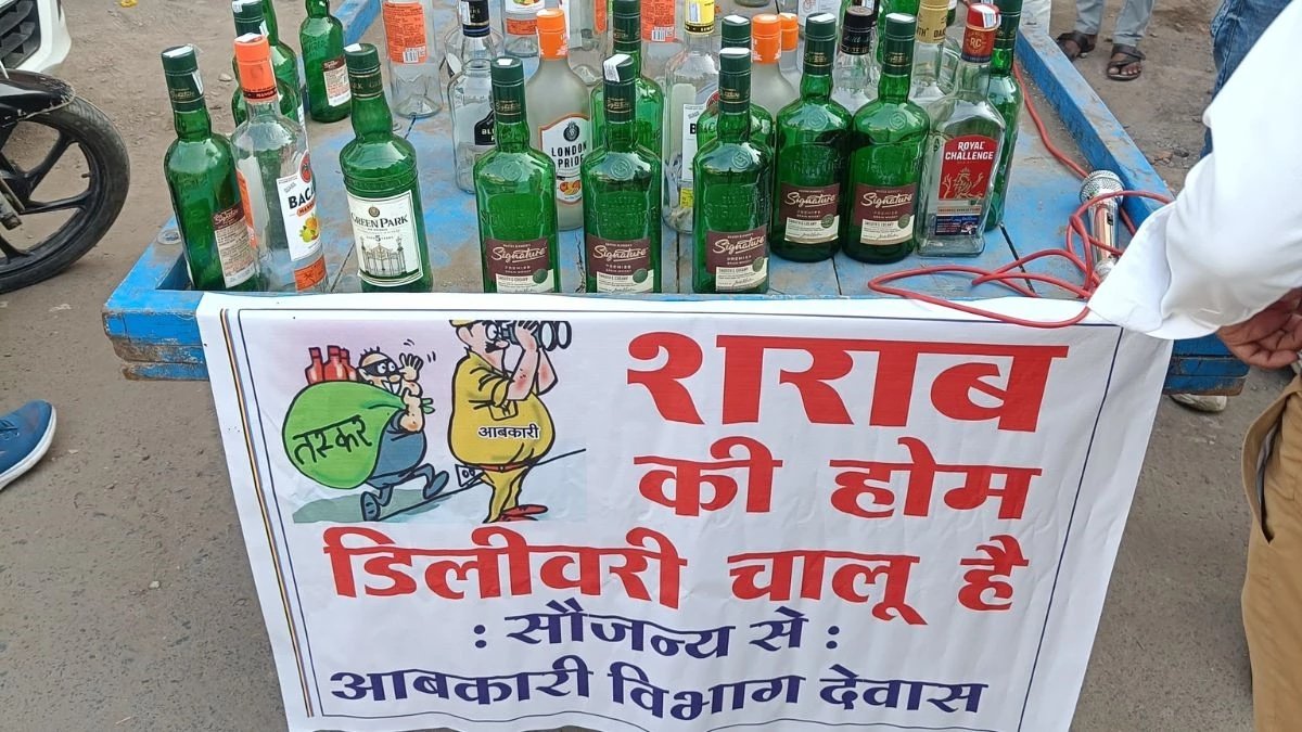देवास। शहर के नोवेल्टी चौराहे पर मंगलवार को युवा कांग्रेस ने अनोखा प्रदर्शन किया। शहर में गली-गली बिक रही अवैध शराब को लेकर आबकारी विभाग को घेरा। ठेले पर शराब की खाली बोतलें सजाकर बाजार में निकले। इस पर लिखा कि शराब की होम डिलीवरी चालू है।